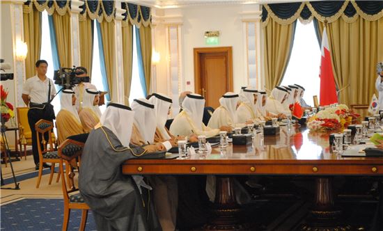 ▲한-바레인 총리 회담장에 바레인 각료들이 정통의상을 입고 나란히 앉아 있다.