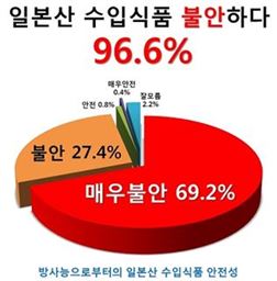 [아시아경제 김혜원 기자] 우리나라 국민 100명 가운데 96명 이상이 '일본산 수입 식품이 방사능 오염으로부터 안전하지 않다'고 느끼는 것으로 조사됐다.