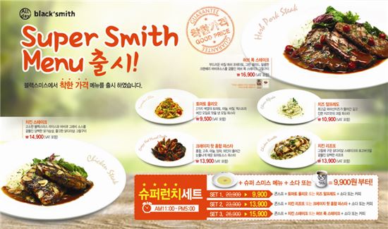 [아시아경제 오주연 기자]가이탈리안 레스토랑 블랙스미스는 파스타와 스테이크를 1만원 미만부터 1만원 초 중반대로 구성한 ‘슈퍼스미스 메뉴' 6종을 출시했다고 2일 밝혔다.파스타 메뉴로는 2가지 색깔의 토마토, 마늘, 바질, 엑스트라 버진 오일로 맛을 낸 오일 파스타인 토마토 올리오(9500원)와 최고급 파마산 치즈가 들어가 깊고 진한 치즈의 맛을 느낄 수 있는 크림 파스타인 치즈 알프레도(1만900원), 홍합, 고추, 마늘, 양파, 와인이 들어가 눈물 나게 매운 크레이지 핫 홍합 파스타(1만3900원) 3종을 선보였다. 이와 더불어 리조또 메뉴로 그릴에 구운 닭다리살 스테이크와 표고버섯을 곁들인 치킨 리조또(1만3900원)와 스테이크 메뉴인 라이스와 바비큐 그레비 소스를 곁들인 닭고기 그릴구이 치킨 스테이크(1만4900원) 및 부드러운 바질 매쉬 포테이토, 그린 샐러드, 크랜베리 바비큐소스를 곁들인 허브 폭 스테이크(1만6900원) 2종을 새롭게 선보였다.블랙스미스는 슈퍼스미스 메뉴 출시와 더불어 오전 11시부터 오후 5시까지 슈퍼스미스 메뉴와 스프, 음료를 함께 저렴하게 즐길 수 있는 ‘슈퍼런치 세트’를 판매한다. 슈퍼런치 세트는 슈퍼스미스 메뉴에 콘스프와 소다 또는 커피가 함께 구성된 세트메뉴로, 9900원과 1만3900원과 1만5900원 3가지 가격대로 선보여 고객들의 선택의 폭을 넓혔다.오주연 기자 moon170@asiae.co.kr<ⓒ세계를 보는 창 경제를 보는 눈, 아시아경제(www.asiae.co.kr) 무단전재 배포금지>