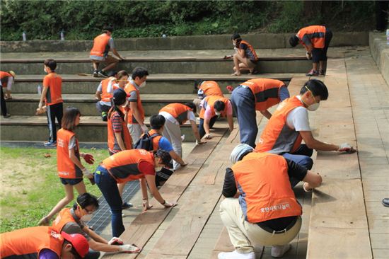 호반건설의 ‘호반사랑나눔이’ 봉사단은 지난 주말 서울숲을 찾아 목재 시설물 보수 봉사활동을 펼쳤다.
