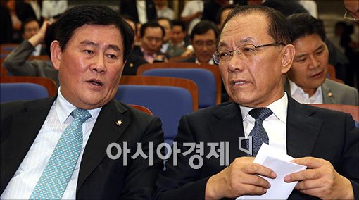[아시아경제 윤동주 기자] 황우여(오른쪽) 새누리당 대표가 3일 서울 여의도 국회에서 열린 의원총회에서 최경환 원내대표와 이야기를 나누고 있다.윤동주 기자 doso7@asiae.co.kr<ⓒ세계를 보는 창 경제를 보는 눈, 아시아경제(www.asiae.co.kr) 무단전재 배포금지>