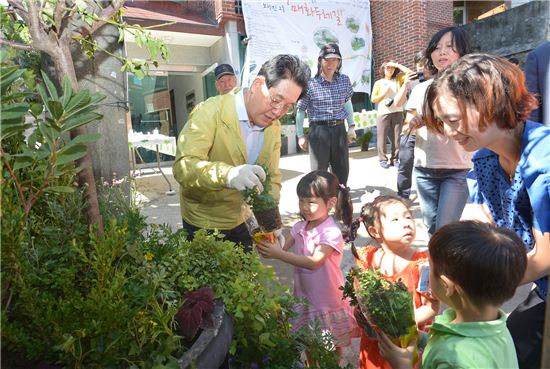 문충실 동작구청장이 어린이들에게 꽃을 전해주고 있다.