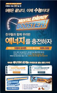 [아시아경제 구채은 기자]디지털대성이 오리온과 제휴를 맺고 에너지 보충 이벤트를 실시, 9월 모의평가를 마친 수험생들에게 닥터유 에너지바를 제공한다.디지털대성의 온라인 대입브랜드 대성마이맥, 티치미, 비상에듀(이하 MTV)는 오는 9월23일까지 ‘친구들과 함께 우리반 에너지를 충전하자’라는 타이틀로 이벤트를 실시하고, 응모 기준을 충족한 반에 닥터유 에너지바 60개를 제공한다.MTV의 홈페이지에서 같은 반 친구 10명을 모아 응원메시지를 작성하면 100% 당첨이 가능하다. 한 반에 1 박스(60개)를 증정하며 선착순 100개 반을 모집한다. 또 SNS에 이벤트를 알린 학생 중 5명을 추첨해 닥터유 에너지바 1박스를 제공한다.이벤트 참여에 대한 자세한 내용은 대성마이맥(www.mimacstudy.com)과 티치미(www.teachme.co.kr), 비상에듀(www.visangedu.com) 홈페이지에서 확인할 수 있다. 구채은 기자 faktum@asiae.co.kr<ⓒ세계를 보는 창 경제를 보는 눈, 아시아경제(www.asiae.co.kr) 무단전재 배포금지>