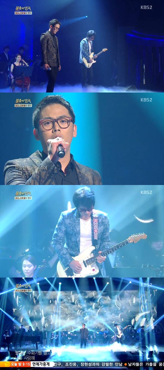 [아시아경제 장영준 기자]그룹 015B(공일오비) 출신 장호일과 OST계의 신성으로 떠오른 기용진이 감수성 충만한 무대를 선사했다.7일 방송된 KBS2 '불후의 명곡'에서는 성대현(R.ef) 장호일(공일오비) DJ처리(철이와 미애) 황규영 현진영 이현우가 전설로 출연해 '오빠 특집 제 2탄'으로 꾸며졌다.이날 첫 번째 순서로 무대에 오른 장호일은 후배 김용진을 위해 직접 기타를 잡았다. 김용진은 특유의 허스키 보이스를 이용해 윤종신의 데뷔곡이기도 한 90년대 공일오비 히트곡 '텅빈 거리에서'를 열창했다. 이를 지켜보는 관객들은 당시의 감성이 그대로 전달된 듯 곡에 집중하는 모습을 보이기도 했다.'텅 빈 거리에서'는 90년대 트렌드를 반영하는 감수성을 윤종신의 미성으로 잘 표현한 곡으로, 015B의 첫 앨범 타이틀곡이자 객원보컬 윤종신의 데뷔곡이기도 하다.한편 이날 방송에서는 장호일-김용진, DJ처리-바다, 이현우-긱스, 황규영-노라조, 성대현-제국의 아이들, 현진영-MC팀(은지원 문희준)이 팀을 이뤄 경합을 벌였다.장영준 기자 star1@asiae.co.kr<ⓒ아시아경제 & 스투닷컴(stoo.com)이 만드는 온오프라인 연예뉴스>