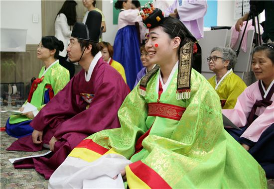 지난해 연남글로벌빌리지센터에서 열린 추석맞이 한국전통예절강좌에 참여한 외국인들이 한복 입는 방법을 배우고 있다.<br />