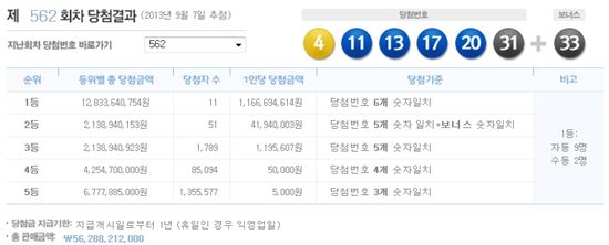 [아시아경제 온라인이슈팀] 로또562회당첨번호가 네티즌들 사이에서 화제다. 지난 9일 추첨한 제562회 나눔로또복권 결과에 따르면 당첨번호는 '4, 11, 13, 17, 20, 31' 등 6개였다. 2등 보너스번호는 '33'이다.이번 나눔로또복권의 1등 당첨자는 총 11명으로 각각 11억6669억원의 당첨금을 수령하게 된다. 당첨번호 5개와 보너스번호가 일치한 2등은 51명으로 4194만원씩을 받게 된다. 당첨번호 5개를 맞힌 3등은 1789명으로 각 119만원씩을 수령할 예정이다.또 당첨번호 4개를 맞힌 4등(고정당첨금 5만원)은 8만5094명, 3개 번호가 일치한 5등(고정당첨금 5000원)은 135만5577명이었다.온라인이슈팀 <ⓒ세계를 보는 창 경제를 보는 눈, 아시아경제(www.asiae.co.kr) 무단전재 배포금지>