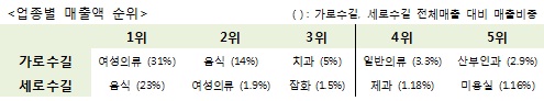 [아시아경제 이현주 기자]신사동에 위치한 가로수길 매출액이 세로수길 매출의 2배인 것으로 나타났다. 가로수길의 매출 중 여성의류 업종은 전체 매출 중 31%로 최근 가로수길을 점령한 SPA브랜드들의 영향으로 보인다. 세로수길은 가로수길 주변과 골목 상권이 위치한 곳으로 가로수길에 있던 기존 음식점 등이 많이 옮겨 위치해있어 음식 업종의 매출이 가장 높았다.11일 BC카드에서 발표한 가로수길과 세로수길 매출데이터 비교분석한 자료에 따르면 지난 6월~8월까지 가로수길에서 발생한 매출액은 66%였으며 세로수길은 34%였다.가로수길에 위치한 여성의류 업종은 전체 매출액 중 31%를 차지했다. 최근 SPA브랜드들이 가로수길에 진출한 것과 연관이 있는 것으로 보인다. 매출액 순위는 뒤를 이어 음식, 치과, 일반의류, 산부인과 업종으로 나타났다.세로수길에 위치한 업종 중 매출액이 가장 높은 업종은 음식으로 나타났으며 여성의류, 잡화, 제과, 미용실이 그 뒤를 이었다.가로수길과 세로수길에서 발생한 연령대별 매출액 중 가장 많이 사용한 연령층은 20대인 것으로 나타났다. 뒤이어 30대, 40대, 50대 순이었다. 시간대별로 매출액을 분석해 본 결과 가로수길은 오후 3시~8시 사이, 세로수길은 오후 6시~11시 사이 매출이 가장 많이 발생한 것으로 확인됐다.BC카드 관계자는 "가로수길은 카페나 레스토랑, 디자이너 숍들이 많아 만남의 장소로 인기를 얻고 있다"며 "이러한 유명세에 힘입어 가로수길 인근에 위치하고 있는 세로수길을 찾는 고객들도 늘어나고 있다"고 말했다.이현주 기자 ecolhj@asiae.co.kr<ⓒ세계를 보는 창 경제를 보는 눈, 아시아경제(www.asiae.co.kr) 무단전재 배포금지>이현주 기자 ecolhj@asiae.co.kr<ⓒ아시아 대표 석간 '아시아경제' (www.newsva.co.kr) 무단전재 배포금지>