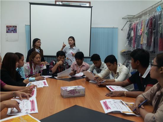 신한크메르은행의 현지 행원들이 프놈펜시 외곽에 위치한 봉제공장단지를 방문해 공장직원들을 대상으로 '적금상품' 설명회를 진행하고 있다.