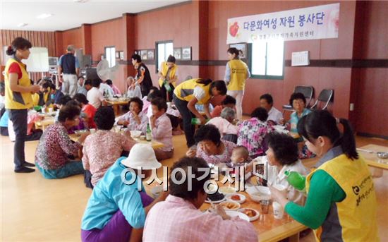“피부색은 다르지만 봉사하는 손길은 아름다워 ” [아시아경제 노해섭 ]장흥군 다문화가족지원센터(센터장 최선자)는 최근 다문화주부로 결성된 '무궁화봉사단'이 대덕읍 산외동 경로당을 방문해 지역 어르신들에게 '효 사랑을 위한 음식나눔' 봉사활동을 펼쳐 화제가 되고 있다. 이날 봉사활동 자리에는 군·읍 관계자를 비롯하여 방문교육 지도사와 단원 등 80여명이 참석한 가운데 화기애애한 분위기속에서 무궁화봉사단이 정성스럽게 장만한 소머리 국밥 을 50여명의 어르신들에게 직접 대접하고 고국에 계신 부모님을 모시듯이 어른을 공경하고 섬기는 기쁨을 나누는 시간을 가졌다. 이용진 이장은 "다문화여성들에게 비록 피부색은 다르지만 이토록 숭고한 정신을 가지고 우리 마을에 찾아와서 좋은 일을 해 주셔서 감사하다"고 말했다.또한, 이날 봉사단원들과 함께 위인숙 방문교육지도사 회장을 비롯한 강미정·정진희·이경화·김형란 선생과 김득숙 선생의 레크레이션 구령에 맞춰 어르신들과 함께 요가와 춤으로 흥을 더하였다. 베트남에서 시집온 지 3년째인 누엔김투 봉사단원은 "명절이 다가오니 고국에 두고 온 부모님 생각이 더욱더 간절하다"면서 "모든 어르신들이 내 부모님 같아 가슴이 뭉클하고 눈시울이 뜨거워 진다"고 전했다. 최선자 센터장은 “지금까지는 다문화가족들이 지자체와 주민들로부터 많은 사랑을 받기만 해 왔지만 앞으로는 그 받은 사랑을 사회로 환원시켜 효도와 공경을 직접 체험할 수 있는 기회를 통해 다문화에 대한 편견을 없애고 봉사의 기쁨을 느낄 수 있게 해 한국 주부로서의 긍지를 갖고 살아갈 수 있도록 다문화 사회통합을 위한 노력을 지속적으로 추진해 나갈 계획이다”고 말했다.노해섭 기자 nogary@<ⓒ세계를 보는 창 경제를 보는 눈, 아시아경제(www.asiae.co.kr) 무단전재 배포금지>
