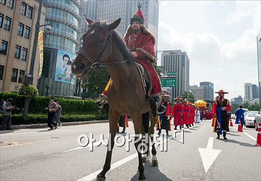 [아시아경제 윤동주 기자] 조선시대 임금님이 사직대제를 봉행하기 위해 사직단으로 향하는 출궁행사인 어가행렬이 재현된 15일 서울 세종로 사거리를 지나고 있다. 사직대제는 조선시대 왕과 문무백관이 통지를 관장하는 사신과 오곡을 주관하는 직신에게 제향을 올리는 전통제례의식으로 1908년(순종 2년) 일제의 강압으로 폐지됐다가 1988년에 다시 원형대로 복원돼 해마다 치러지고 있다.윤동주 기자 doso7@asiae.co.kr<ⓒ세계를 보는 창 경제를 보는 눈, 아시아경제(www.asiae.co.kr) 무단전재 배포금지>