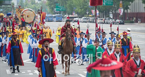 [아시아경제 윤동주 기자] 조선시대 임금님이 사직대제를 봉행하기 위해 사직단으로 향하는 출궁행사인 어가행렬이 재현된 15일 서울 세종로 사거리를 지나고 있다. 사직대제는 조선시대 왕과 문무백관이 통지를 관장하는 사신과 오곡을 주관하는 직신에게 제향을 올리는 전통제례의식으로 1908년(순종 2년) 일제의 강압으로 폐지됐다가 1988년에 다시 원형대로 복원돼 해마다 치러지고 있다.윤동주 기자 doso7@asiae.co.kr<ⓒ세계를 보는 창 경제를 보는 눈, 아시아경제(www.asiae.co.kr) 무단전재 배포금지>