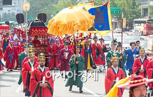 [아시아경제 윤동주 기자] 조선시대 임금님이 사직대제를 봉행하기 위해 사직단으로 향하는 출궁행사인 어가행렬이 재현된 15일 서울 세종로 사거리를 지나고 있다. 사직대제는 조선시대 왕과 문무백관이 통지를 관장하는 사신과 오곡을 주관하는 직신에게 제향을 올리는 전통제례의식으로 1908년(순종 2년) 일제의 강압으로 폐지됐다가 1988년에 다시 원형대로 복원돼 해마다 치러지고 있다.윤동주 기자 doso7@asiae.co.kr<ⓒ세계를 보는 창 경제를 보는 눈, 아시아경제(www.asiae.co.kr) 무단전재 배포금지>