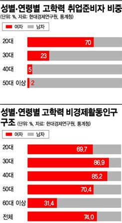 수치로 확인해보자. 올해 1분기 20대 고학력 백수는 모두 62만9000명이었다. 고학력 비경제활동인구의 20.4%에 달했다. 이 중 취업을 준비하는 대졸자는 27만9000명으로 4년제 졸업생이 18만8000명이었다. 취업난에 구직을 아예 포기하는 청년도 21만3000명이나 됐다. 고학력 백수는 남성보다 여성이 많다. 대학을 졸업하고도 일을 하지 않는 20대 남성은 19만명인 반면 여성은 43만명을 웃돌았다. 현대경제연구원 김광석 선임연구원은 "전공이나 경력에 맞는 일자리, 임금수준이나 근로조건에 맞는 일자리가 없어서 나타난 현상"이라고 설명했다. 괜찮은 일자리는 줄었고 그 일자리를 원하는 고학력자는 늘었다는 것이다. 이 경우 보상심리 때문에서라도 시간을 더 들여 양질의 일자리에 취업하려 한다. 실제로 20대 고학력 백수의 87~90%는 '원하는 임금수준이나 근로조건이 맞는 일자리가 없어' 직장을 구하지 않고 있었다. 김 선임연구원은 "전공, 경력수준이 높은 고급인력이 많이 배출됐지만 이들을 고용시장으로 이끌 흡인력이 없다"고 말했다. 상황이 이렇다보니 취업준비생 10명 중 2명은 30대를 훌쩍 넘길 만큼 취업준비생도 고령화됐다. 고학력자의 일자리 시장 진입이 늦어지는 것은 그들만의 문제가 아니다. 늦어진 취업은 결혼을 미루거나 기피하게 되는 주된 이유로 작용한다. 보건복지부가 전국 남녀 1만3000명을 대상으로 조사한 결과 여성의 86%가 고용불안정과 경제적인 이유로 결혼을 꺼린다고 응답했다. 평균 초혼 연령은 29.4세로 1년 전보다 0.3세 늦어졌다. 취업 연령이 높아지면서 결혼과 임신까지 잇따라 미뤄지는 악순환이다. 일을 해야 할 청년이 고용시장에서 쓰이지 않고 있는 것은 경제 성장에도 부정적이다. 해결할 수 있는 방법은 없을까. 이론적으로는 20대 여성이 처음부터 양질의 일자리에 취업할 수 있도록 좋은 일자리를 많이 만들면 된다. 그러나 좋은 일자리란 게 말로만 만들어지는 것은 아니다.전문가들은 학업과 고용의 연계성을 높여야 한다고 조언한다. 대학에 다니면서 취업준비를 마칠 수 있는 환경을 조성해야 한다는 것이다. 김광석 연구위원은 "교과과정과 산업을 연계한 시스템을 조성해 '졸업한 취업준비자'를 줄여야 한다"고 말했다. 중소ㆍ중견기업의 이미지를 제고하고 임금 등 근로조건을 개선해 고학력자를 유인해야 한다는 지적도 나온다. 김 연구위원은 "중소기업의 구인난과 청년층의 구직난 미스매치 현상을 해소하기 위해 노동 수요측과 공급측의 연결성을 높일 필요가 있다"고 강조했다. ②직장맘은 3'치'다…일하는게 무슨죄?# 3살 된 아이를 키우고 있는 워킹맘 박모(35ㆍ여)씨는 요즘 직장을 그만둬야 할 지 고민이다. 그동안 아이를 돌봐줬던 친정어머니가 건강상의 이유로 더 이상 봐줄 수 없게 된 것이다. 어린이집을 수소문했지만 대기자 수가 100명이 넘고 육아도우미를 구하기에는 금전적 부담이 크다. 박씨는 "헤어지기 싫어하는 아이를 떼어놓고 출근하는 것이 매번 눈에 밟혔는데 이참에 전업주부로 돌아서야 하는 건지 고민"이라고 말했다. # 직장생활 11년차에 접어든 김모(39ㆍ여)씨는 또 다시 돌아온 방학시즌이 두렵다. 마땅히 봐줄 사람이 없어 출근하고 나면 9살 난 딸아이 혼자 있어야 하기 때문이다. 일부러 학원을 여러 군데 보내지만 밥은 잘 챙겨먹고 있는지, 위험한 곳에 가진 않는지 하루 종일 아이 걱정에 일도 손에 잡히지 않는다. 김씨는 "초등학생 자녀를 둔 워킹맘들은 아이의 방학이 가장 두렵다"며 "친구어머니에게 부탁하거나 친정어머니께 다시 도움을 요청하는 수밖에 없다"고 토로했다.