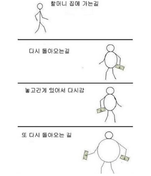 [아시아경제 온라인이슈팀] 추석을 맞아 '할머니 집 갈 때 공감 2탄'이 공개돼 눈길을 끌고 있다.최근 각종 온라인 커뮤니티 게시판에는 '할머니 집 갈 때 공감 2탄'이라는 제목의 네 컷 만화가 게재됐다. 이는 할머니 댁에 다녀온 손자의 변화를 나타낸 그림으로 홀쭉한 몸에 빈손으로 간 손자는 배가 불룩하게 나온 채 용돈까지 들고 나온다. 이어 놓고 간 물건을 찾으러 들어갔다가 양 손에 용돈을 쥐고 더욱 배가 부른 채 돌아가고 있다. 할머니 집 갈 때 공감 1탄보다 두 컷 더 늘어난 2탄은 주인공이 용돈을 쥐고 있는 모습까지 추가돼 네티즌들의 웃음과 공감을 자아냈다. 할머니 집 갈 때 공감 2탄을 접한 이들은 "할머니의 사랑을 느낄 수 있다", "명절이라 더욱 더 할머니가 보고 싶다", "할머니 집 갈 때 공감, 이번 추석 딱 내 이야기다" 등의 반응을 보였다.온라인이슈팀 <ⓒ세계를 보는 창 경제를 보는 눈, 아시아경제(www.asiae.co.kr) 무단전재 배포금지>