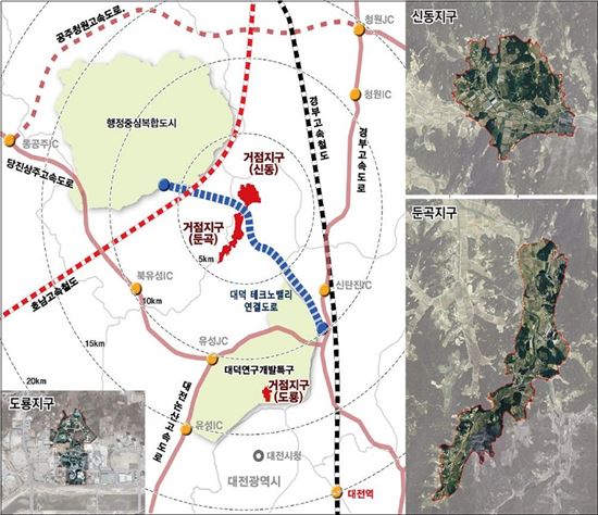 국제과학비즈니스벨트 거점지구인 대전시 유성구 둔곡, 신동 위치도.