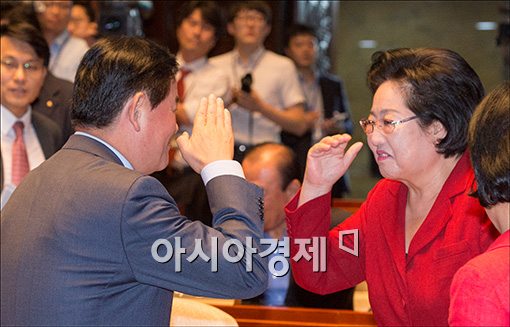 [아시아경제 윤동주 기자] 최경환 새누리당 원내대표(왼쪽)가 23일 서울 여의도 국회에서 열린 의원총회에서 김을동 의원과 인사를 나누고 있다.윤동주 기자 doso7@asiae.co.kr<ⓒ세계를 보는 창 경제를 보는 눈, 아시아경제(www.asiae.co.kr) 무단전재 배포금지>