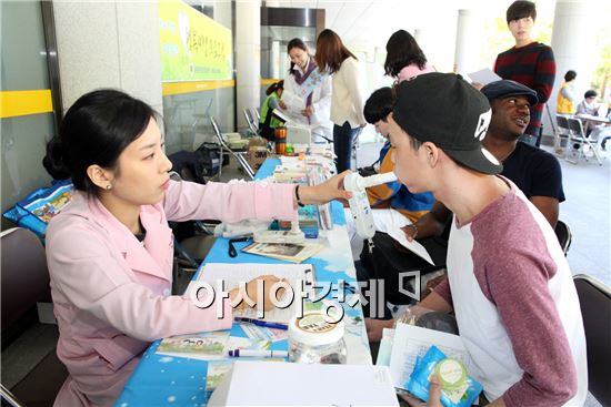 [아시아경제 노해섭 기자]광주광역시 동구보건소는 26일 조선대학교 중앙도서관 앞에서 조선대학교 학생 및 교직원을 대상으로 호기일산화탄소측정, 니코틴 의존도평가 등을 실시하고 금연보조제를 지급하는 등 적극적인 금연 캠페인을 실시했다. 사진제공=광주시 동구 노해섭 기자 nogary@<ⓒ세계를 보는 창 경제를 보는 눈, 아시아경제(www.asiae.co.kr) 무단전재 배포금지>