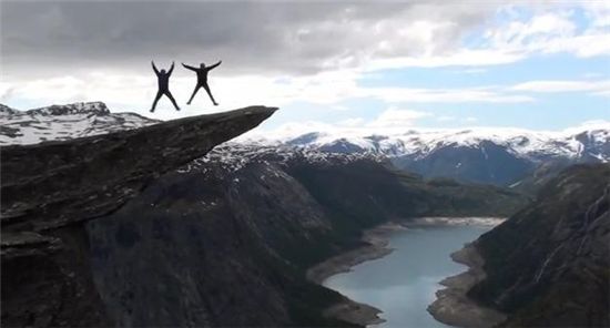 [아시아경제 온라인이슈팀]세계 최고 전망대 '트롤퉁가(Trolltunga)'에서 촬영한 사진이 공개됐다.최근 한 온라인 커뮤니티에 올라온 이 사진은 두 사람이 세계 최고 전망대 '트롤퉁가'에서 점프하는 모습이 담겨있다. 친구로 보이는 이들은 아찔한 낭떠러지에서 점프하며 자신들의 강심장을 자랑하고 있다.노르웨이 남서부 하르당에르(Hardanger)에 위치한 트롤퉁가는 북유럽 전설 속에 등장하는 거인 '트롤의 혀'라는 뜻이다. 혀처럼 툭 튀어나온 특유의 생김새로 인해 이런 이름이 붙여졌다. 트롤퉁가는 해수면 기준으로 950m 높이에 있으며 한눈에 링게달 호수를 내려다 볼 수 있어서 세계 최고의 전망대로 불린다. 아찔한 높이지만 스릴을 좋아하는 사람이라면 한번쯤은 가보고 싶은 장소다.세계 최고 전망대 트롤퉁가를 본 네티즌들은 "혓바닥바위에서 뛰는 거 같네.", "나도 저기서 뛰고 싶다", "북유럽은 저렇게 아름다운 곳이 많은 듯" 등 다양한 반응을 보였다. 온라인이슈팀 <ⓒ세계를 보는 창 경제를 보는 눈, 아시아경제(www.asiae.co.kr) 무단전재 배포금지>