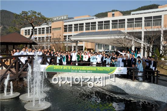 지난 3월 화순전남대병원을 방문한 JCI 재인증 평가단의 현장점검이 끝난후, 병원 임직원들이 함께 모여 파이팅을 외치고 있다.