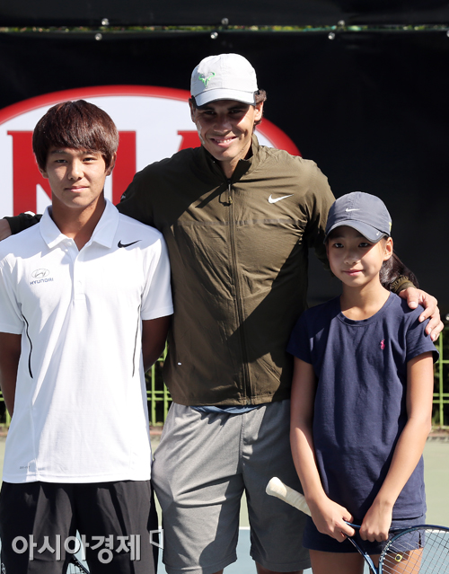 [아시아경제 정재훈 기자] 방한한 테니스 스타 라파엘 나달이 27일 오후 서울 쉐라톤 그랜드 워커힐 호텔 내 테니스 코트에서 테니스 꿈나무 이덕희, 박민진과 기념촬영을 갖고 있다.정재훈 기자 roze@asiae.co.kr<ⓒ세계를 보는 창 경제를 보는 눈, 아시아경제(www.asiae.co.kr) 무단전재 배포금지>