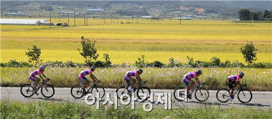[아시아경제 노해섭 기자]화창한 가을 날씨가 이어진 가운데 27일 전남 강진군 일원에서 펼쳐진 Tour de Korea 2013 스페셜대회 참가자들이 노랗게 물든 가을들판을 전력을 다해 달리고 있다. 서울올림픽 25주년을 기념해 열린 이번 강진대회에는 대한사이클연맹 마스터즈 사이클투어 등록선수 200명이 참가해 팀 별로 순위를 가리는 단체도로경기로 28.3km치러졌는데 세블 힐스(Seven Hills) 팀이 팀 구간 우승을 차지했고 문성욱(2nd Wind-WSC)선수가 개인종합 선두로 나섰다.