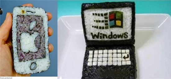 [아시아경제 온라인이슈팀] 일명 '김밥 스마트폰'과 '김밥 노트북'이 온라인상에서 눈길을 끌고 있다. 최근 해외 온라인 커뮤니티 게시판에는 애플 아이폰과 윈도 노트북 모양의 김밥 사진이 한 장 올라왔다. 이 사진 속에는 스마트폰의 버튼과 화면 이외에 애플 로고를 빗댄 사과 모양의 로고까지 표현돼 있어 네티즌들의 관심을 모으고 있다. 사진 아래에는 애플의 새로운 아이폰을 사고 싶지만 참아야 하는 사람들에게 포만감을 선물해 충동구매를 막아준다는 설명까지 나와 있어 웃음을 불러일으킨다. 또한 키보드와 윈도 로고를 선명하게 묘사한 김밥 노트북은 접시 안에 담겨 앙증맞기까지 하다. 김밥 스마트폰 사진을 본 네티즌들은 "김밥 스마트폰, 분식점에서 팔면 대박이겠네", "김밥 노트북, 디테일이 살아있다", "비싼 스마트폰과 노트북, 살 수도 없으니 김밥으로 만들어 봐야겠다" 등 재미있는 반응을 보였다. 온라인이슈팀 <ⓒ세계를 보는 창 경제를 보는 눈, 아시아경제(www.asiae.co.kr) 무단전재 배포금지>