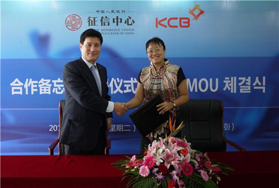 ▲김상득 KCB대표이사(왼쪽)가 왕 지아오레이 중국 인민은행 신용정보센터 국장과 협약식을 체결하고 있다.