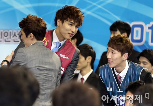 [아시아경제 정재훈 기자] 30일 오후 서울 잠실학생체육관에서 열린 2013 KBL 국내신인선수 드래프트. 차례로 LG, KCC, 동부에 지명된 경희대 3인방 김종규, 김민구, 두경민이 인사를 나누고 있다.정재훈 기자 roze@asiae.co.kr<ⓒ세계를 보는 창 경제를 보는 눈, 아시아경제(www.asiae.co.kr) 무단전재 배포금지>