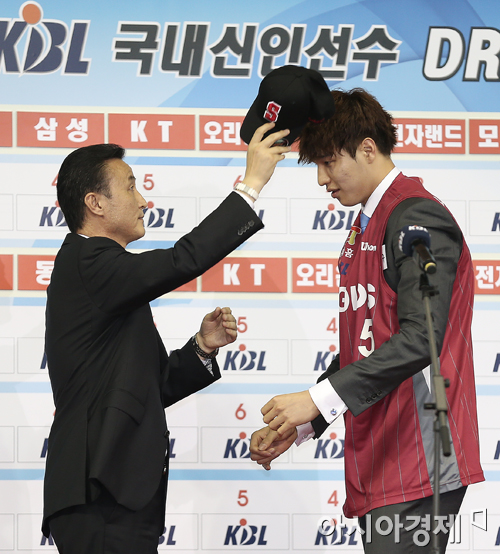 [아시아경제 정재훈 기자] 30일 오후 서울 잠실학생체육관에서 열린 2013 KBL 국내신인선수 드래프트. 창원 LG 김진 감독이 경희대 김종규에게 모자를 씌워주고 있다. 정재훈 기자 roze@asiae.co.kr<ⓒ세계를 보는 창 경제를 보는 눈, 아시아경제(www.asiae.co.kr) 무단전재 배포금지>