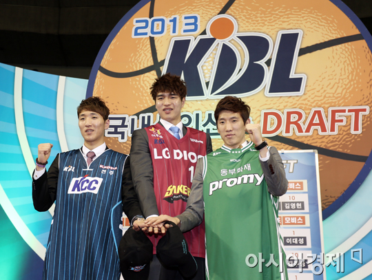 [아시아경제 정재훈 기자] 30일 오후 서울 잠실학생체육관에서 열린 2013 KBL 국내신인선수 드래프트. 차례로 LG, KCC, 동부에 지명된 경희대 3인방 김종규(가운데), 김민구(왼쪽), 두경민(오른쪽)이 포즈를 취하고 있다.정재훈 기자 roze@asiae.co.kr<ⓒ세계를 보는 창 경제를 보는 눈, 아시아경제(www.asiae.co.kr) 무단전재 배포금지>