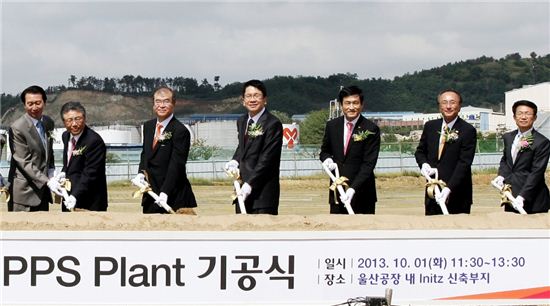 이니츠 PPS 공장 기공식 참석자들이 시삽 행사를 진행하고 있는 모습. 사진 왼쪽 두번째부터 박맹우 울산시장, 오야기 데이진 사장, 최창원 SK케미칼 부회장, 이문석 SK케미칼 사장, 후쿠다 데이진 전무, 박찬중 SK케미칼 부문장.