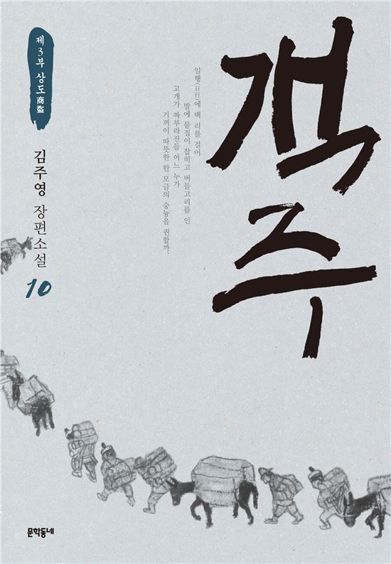 '장터문학의 대서사'가 완성됐다. 객주의 완결편 제 10권은 30여년이 넘는 대장정의 마침표다. 기존 9권까지와는 달리 정경유착의 형성과 배경, 관료와 상업세력 결탁, 비리 등 우리 자본주의의 어두운 일면도 다뤄 김주영 문학의 변화를 읽을 수 있다. 객주는 김주영문학의 만년작이자 한국문학사의 기념비적인 작품이기도 하다. 객주는 1979년 6월1일부터 1984년 2월29일까지 서울신문에 1465회(1∼9권) 연재하고 중단됐었다. 이번에 출간된 10권은 1, 2, 3권 제1부 외장(外場)과 4, 5, 6권 제2부 경상(京商)에 이어, 7, 8, 9권 제3부 상도(商盜)에 속한다.김주영은 "소설을 쓰게 한 원동력은 가난과 결핍, 보잘 것 없는 이력, 평범한 사람들의 삶에서 전해진 아픔들"이라고 정의한다. 김주영은 스스로를 밑바닥 서민이라고 칭하며 단 한번도 문단의 주류로 인식하지 않았다고 말한다. 문단의 많은 교우들은 고향인 청송 진보 잎담배 생산조합 서기로 살면서 문학의 꿈을 버리지 못했던 시절, 간혹 상경할라치면 종이에 싸인 안동 간고등어를 건네던 순박함을 잊지 못 한다. 그래서 김주영 문학의 힘을 내면의 순박함, 촌놈 근성, 서민 의식 등에서 비롯됐다고 평하기도 한다. "9권을 쓴 이후 30년동안 생애의 전체가 불편했다. 이제야 겨우 후련해졌다. 10권을 쓰게 해준 울진, 봉화의 옛 보부상과 그들의 유물, 그 당시를 살다간 사람들에게까지 감사한 마음이다. 긴 소설을 마칠 수 있게 해준 수많은 독자둘에게도 감사한다."객주는 조선 후기 보부상들의 파란만장한 삶을 그리고 있다. 김주영의 대하소설로 한국 역사사회소설의 한 획을 그으며 폭발적인 인기를 끌었다. 이 소설은 1878년부터 1885년까지 보부상들의 삶을 통해 조선 후기의 시대상을 생생하게 담아낸다. 소설 속 주인공 천봉삼은 정의감과 의협심 강한 인물이다. 그를 따라 150여년전 보부상들의 유랑길을 동행하면 근대 상업자본의 형성 과정, 피지배자인 백성의 고단한 삶을 만날 수 있다. 객주는 금융업, 유통업, 창고보관업 및 물류업을 하던 장소이자 그런 행위를 하는 상인을 말한다. 김주영은 "처음 객주를 쓸 때는 밤마다 담배 두갑, 커피 열잔씩 마시며 5년여간 밤을 새다시피 했다. 연재할 때는 너무도 힘들어 내팽개치고 싶은 적이 하루에도 열두번이 넘었다"며 "(지금은) 모든 열정이 다 소진된 것처럼 허탈하고도 편안하다"고 말했다. "고향에 대한 그리움은 무엇보다도 한국 고유의 언어를 복구하려는 노력으로 나타난다. 대대로 전수된 옛말과 속담의 활용, 민간에 유통된 비유와 사설의 구사, 민중 풍속에 밀착된 재담과 육담의 연출이라는 면에서 객주를 능가하는 소설은 없다. 더욱이 그것은 다양한 대중서사 장르의 혼성물이다. 신분과 지역의 경계를 넘나드는 상인들의 모험은 피카레스크 소설 코드, 숱하게 많은 모략과 복수의 이야기는 의협 활극 코드, 계급과 장소에 특유한 인생살이 묘사는 풍속소설 코드, 작중 곳곳에 박힌 격언과 요설과 타령은 구술 연희 코드와 연결돼 있다. 그런 점에서 객주는 고유 언어의 보물창고일 뿐만 아니라 대중서사의 백과전서이기도 하다. "황종연(문학평론가) 제 9권과 제 10권 사이에 30년이라는 간극이 존재하는 것에 대해 김주영은 "객주를 쓸 당시 초기 자본주의와 관련 경제사료가 전무하다시피 했다. 역사학도도 아닌 나로서는 문학적 상상력, 열정만으로 끌고 나가기에는 힘이 부쳤다. 인문학적 한계에 부딪치면서 다시 공부하고 난 다음 쓰자는 게 30년 걸렸다"고 술회한다. 그가 다시 객주에 집념할 수 있게 해준 것은 다름 아닌 보부상비석이었다. 십이령 보부상비는 일제 때 보부상들이 십시일반, 철로 제작해 백두대간에 세운 송덕비다. 김주영은 "4년전, 흥부장(청송)과 춘양장(봉화)을 넘는 십이령 여행길에서 보부상비석, 보부상길을 발견하고는 소금을 나르는 보부상의 원형을 만나면서 이제는 쓸 수 있겠구나 하는 생각이 들었다"고 고백한다. 즉 울진 죽변항에서 내륙 봉화로 이어지는 소금길인 십이령 고개가 그 모습을 드러냄으로써 30여 년 만에 객주 10권이 씌어질 수 있었다는 설명이다. 김주영은 "그간 서울 송파와 남부지방을 잇는 보부상의 활동상을 그렸지만 소금장수에 대한 얘기를 담지 못 했다. 마침 택리지에 울진 염전에 대한 기록이 있고, 소금, 건어물 등 해산물이 백두대간을 넘어 애오개시장으로 전해진 내력을 접하면서 마지막 작업을 완료할 수 있었다"라고 술회한다.객주는 물산객주, 해물객주, 젓갈객주 등으로도 불린다. 소설 객주의 배경은 조선말 울진, 봉화, 삼척 등 영남 등 백두대간의 남쪽과 서울 애오개시장 등으로 연결되는 서민경제의 한 복판이다. 등장인물들은 주인공 천봉삼을 중심으로 시대의 변방을 이루는 장삼이사들이다. 그들이 살아가면서 빚어내는 시대의 언어는 '경제', 먹고 사는 문제다. 시장에는 온갖 물건 뿐만 아니라 사기꾼, 작부, 상인, 어수룩한 일꾼들이 어우러져 다양한 삶이 질펀하게 펼쳐져 있다. 보부상들은 장터와 장터를 이어가며 여러 사람들의 삶을 이어준다. 김주영은 "주인공 천봉삼은 내가 닮고 싶은 인물이며 우리 시대의 자본가들이 닮았으면 좋겠다는 