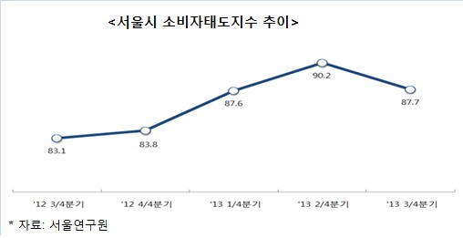 서울시, 3분기 소비자태도지수 4분기 만에 하락 반전산업생산·소매점판매액지수·청년층 취업증가율 모두 약세저소득-고소득층 간 체감경기 괴리도 커져[아시아경제 이혜영 기자] 서민들이 느끼는 체감경기가 살아날 기미를 보이지 않고 있다. 올해 3분기 서울지역 소비자태도지수가 4분기 만에 하락 반전해 전반적인 경기 침체를 반영했고, 산업생산과 소비·고용이 모두 '트리플 약세'를 기록해 당분간 경기체감 반등을 이뤄지기는 어려울 전망이다. 4일 서울연구원이 발표한 '2013년 3·4분기 서울지역 소비자 체감경기 전망'에 따르면 올해 3분기 소비자태도지수는 87.7%로 4분기 연속 상승세에 마침표를 찍었다. 체감경기를 대표하는 소비자태도지수는 전분기 90.2%보다 2.5%포인트 감소해 지난 1분기 수준으로 돌아갔다.