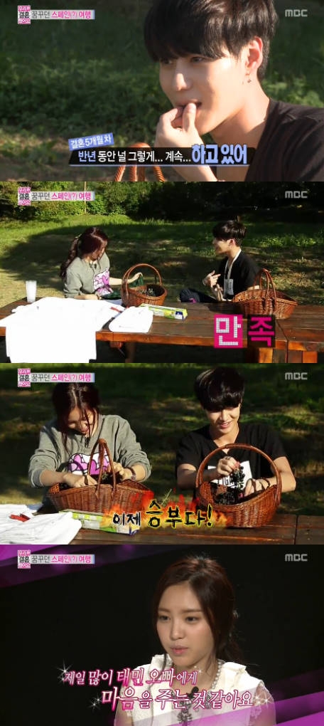 [아시아경제 스포츠투데이 이지원 기자]그룹 샤이니 태민이 걸그룹 에이핑크 손나은의 '오·사·빠'를 자처했다. 태민은 5일 오후 방송한 MBC 예능프로그램 '우리결혼했어요4'(이하 '우결4')에서 "나는 오래 사랑에 빠지는 '오·사·빠'가 될 것"이라고 말했다. 이날 방송에서는 손나은이 "금방 사랑에 빠지는 '금·사·빠'는 그만큼 빨리 사랑에서 빠져 나오는 것 아니냐"고 태민에게 물었다.이에 태민은 "나는 너에게 '오·사·빠'가 되겠다"고 답하며 애정을 드러냈다.또 그는 "머루를 늦게 딴 사람이 상대방에게 마음을 얼마나 열었는지 말해보자"며 손나은과 머리 빨리 따기 승부를 벌였다. 손나은의 방해공작에도 불구, 승부에서 이긴 태민은 "나를 얼마나 좋아하냐?"고 물었다. 이에 손나은은 수줍어하며 "나도 (마음이)열렸어"라고 말했고, 이를 들은 태민은 함박웃음을 지으며 기쁨을 감추지 못했다. 또 손나은은 개인 인터뷰 시간에 "내가 그동안 좋아했던 사람들 중에서는 태민 오빠한테 제일 마음을 많이 준 것 같다"고 밝혀 눈길을 끌었다. 한편, '우결4'는 매주 토요일 오후 4시 50분에 방송한다. 이지원 기자 midautumn@stoo.com<ⓒ세계를 보는 창 경제를 보는 눈, 아시아경제(www.asiae.co.kr) 무단전재 배포금지>