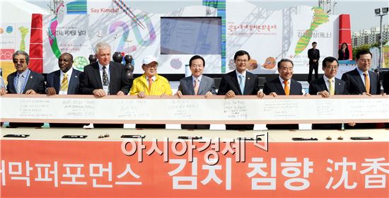 "오는 9일까지 중외공원 일원서 개최""‘남도김치, 세계로 날다’를 주제로 체험행사 등 총 54종 프로그램 펼쳐"[아시아경제 노해섭 기자]올해 20회를 맞는 광주세계김치문화축제가 5일부터 9일까지 5일간 중외공원 일원에서 열린다. 올해 행사는 ‘남도김치, 세계로 날다’를 주제로 전시, 경연, 공연, 체험행사 등 총 54종의 다양한 프로그램들이 펼쳐진다.성년이 되는 올해 김치축제는 지난 9월 서울 경복궁에서 개최한 사전 특별행사와 세계한상대회 기간과 연계해 10월말 진행하는 특별 전시 행사를 별도로 준비해 성년을 기념하고 축제 규모를 확대해 운영했다. 개막일인 5일 두산 벨라(Dusan Bella) 주한 슬로바키아 대사 등 국내외 귀빈들이 대거 참석했다. 또한, 홍보대사로 위촉된 한국홍보전문가 서경덕 교수와 최근 인기리에 방송중인 ‘주군의 태양’에 출연하는 중견배우 이종원씨, 박기태 VANK 단장과 김치버스팀 리더 류시형씨가 함께 개막식에 방문해 팬사인회를 열었다.