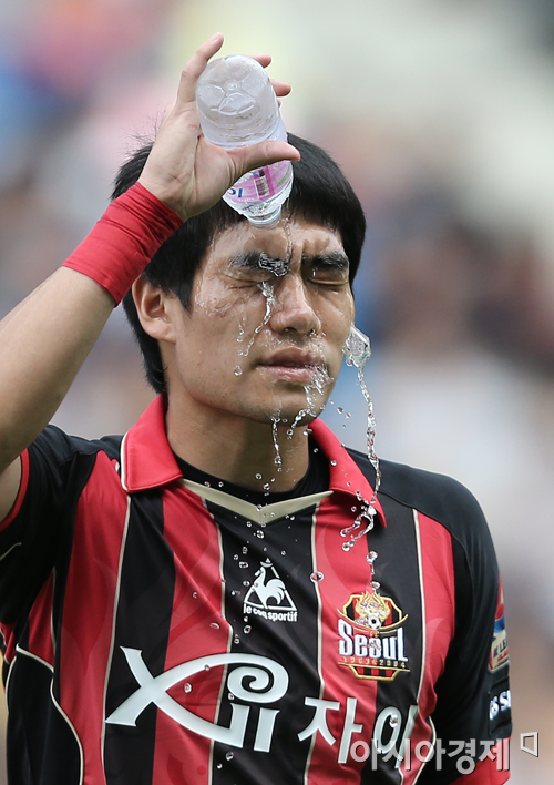 [인천=아시아경제 정재훈 기자] 6일 오후 인천축구전용경기장에서 열린 '현대 오일뱅크 K리그 클래식 2013' 인천 유나이티드와 FC서울의 경기. 김주영이 얼굴에 물을 뿌리고 있다.정재훈 기자 roze@asiae.co.kr<ⓒ세계를 보는 창 경제를 보는 눈, 아시아경제(www.asiae.co.kr) 무단전재 배포금지>