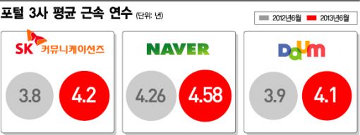 [아시아경제 조유진 기자]국내 포털업계 남녀의 근속연수가 최근 1년 사이 최대 10% 길어진 것으로 나타났다. 남녀 평균 근속연수는 타 업종에 비해 짧은 편이지만 여성 우위 경향은 두드러진다.7일 금융위원회와 포털 각사에 따르면 국내 포털 3사의 남녀 평균 근속연수가 올 상반기 기준 1년 전에 비해 5~10% 길어진 것으로 나타났다. 국내 3위 포털 네이트를 운영하는 SK커뮤니케이션즈는 남녀의 평균 근속연수가 3.8년(2012년 6월 30일)에서 4.2년(2013년 6월 30일)으로 포털 3사 가운데 가장 크게(10.52%) 늘었다. 네이버의 평균 근속연수는 4.58년으로 1년 전(4.26년)에 비해 7.5% 늘었다. 다음의 남녀 평균 근속연수는 4.1년으로 1년 전 3.9년에 비해 5.1% 늘었다. 성별로 보면 여자 직원의 평균 근속연수가 남자 직원보다 더 긴 것으로 나타났다. 네이버는 남녀 평균 근속 연수가 각각 4.48년, 4.72년으로 집계돼, 여성 직원이 남성 직원보다 평균 0.24년 더 긴 것으로 나타났다. 다음커뮤니케이션과 SK커뮤니케이션즈도 각각 0.2년과 0.1년이 더 길었다. 남녀간의 근속 연수 격차도 타 업종에 비해 짧은 편이지만, 여성 우위 경향은 두드러진다. 업계 관계자는 "출퇴근 시간이나 노동 강도 면에서 여성 인력들에게 유리한 구조를 갖고 있다"며 "인터넷 산업은 평균 근속연수 4년 내외라는 점에서 직업 안정성은 낮지만, 여성 우위 경향은 두드러진다는 점이 특징"이라고 말했다. 조유진 기자 tint@asiae.co.kr<ⓒ세계를 보는 창 경제를 보는 눈, 아시아경제(www.asiae.co.kr) 무단전재 배포금지>