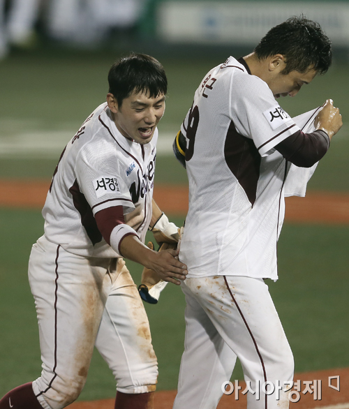 [아시아경제 정재훈 기자] 넥센 히어로즈가 8일 오후 서울 목동야구장에서 열린 두산 베어스와의 '2013 한국야쿠르트 세븐 프로야구 준플레이오프 1차전'에서 이택근의 끝내기 안타로 4:3 승리를 거뒀다. 서건창이 이택근의 엉덩이를 때리고 있다.정재훈 기자 roze@asiae.co.kr<ⓒ세계를 보는 창 경제를 보는 눈, 아시아경제(www.asiae.co.kr) 무단전재 배포금지>
