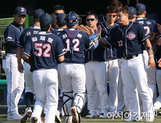 [아시아경제 정재훈 기자] 9일 오후 서울 목동야구장에서 열린 '2013 한국야쿠르트 세븐 프로야구 준플레이오프 2차전' 넥센 히어로즈와 두산 베어스의 경기. 두산 선수들이 2회말 수비를 마치고 덕아웃으로 향하고 있다. 정재훈 기자 roze@asiae.co.kr<ⓒ세계를 보는 창 경제를 보는 눈, 아시아경제(www.asiae.co.kr) 무단전재 배포금지>