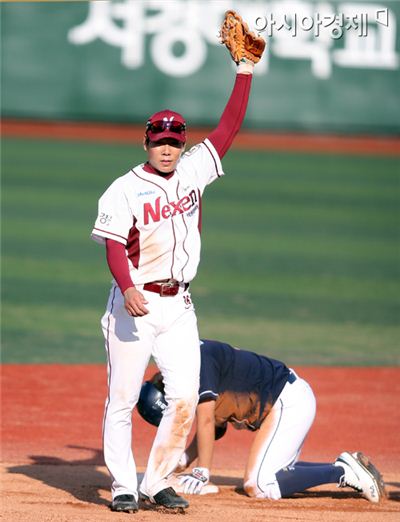 [아시아경제 정재훈 기자] 9일 오후 서울 목동야구장에서 열린 '2013 한국야쿠르트 세븐 프로야구 준플레이오프 2차전' 넥센 히어로즈와 두산 베어스의 경기. 7회초 선두타자 정수빈이 번트 후 악송구를 틈타 2루까지 달리다 강정호에게 태그아웃 당하고 있다.정재훈 기자 roze@asiae.co.kr<ⓒ세계를 보는 창 경제를 보는 눈, 아시아경제(www.asiae.co.kr) 무단전재 배포금지>