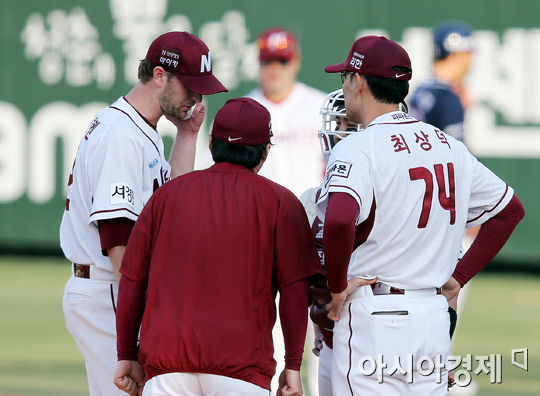 [아시아경제 정재훈 기자] 9일 오후 서울 목동야구장에서 열린 '2013 한국야쿠르트 세븐 프로야구 준플레이오프 2차전' 넥센 히어로즈와 두산 베어스의 경기. 밴 헤켄이 8회초 선두타자 홍성흔에게 볼넷을 내주고 최상덕 코치와 대화를 나누고 있다.정재훈 기자 roze@asiae.co.kr<ⓒ세계를 보는 창 경제를 보는 눈, 아시아경제(www.asiae.co.kr) 무단전재 배포금지>