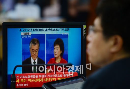 [아시아경제 백소아 기자] 국정감사가 시작된 14일 서울 종로구 보건복지부에서 열린 국정감사에서 정승조 민주당 의원이 지난 대선토론회 화면을 참고자료로 보여주고 있다. 보건복지부 국정감사는 박근혜 정부의 복지공약 후퇴 논란을 둘러싼 여야 공방이 불붙을 것으로 예상된다.백소아 기자 sharp2046@asiae.co.kr<ⓒ세계를 보는 창 경제를 보는 눈, 아시아경제(www.asiae.co.kr) 무단전재 배포금지>