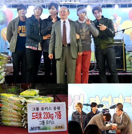 [아시아경제 박건욱 기자]아이돌 그룹 유키스가 따뜻한 마음 나누기에 나섰다. 유키스는 지난 12일 오후 서울 중구에 위치한 사회복지법인 남산원에서 열린 '2013 남산원 사랑나눔 자선 바자회'에 깜짝 등장해 쌀을 기부했다. 이 날 유키스는 자신들의 팬클럽 키스미(KISSme) 이름으로 쌀 230kg를 직접 기부했다. 일부 멤버들이 개인적인 사정으로 참석하지 못해 공연에 동참하지 못했지만 리더 수현을 비롯 기섭, 일라이, 훈, 케빈이 남산원을 찾아 바자회에 참석해 분위기를 한껏 달궜다. 리더 수현은 "얼마 전 일렉트로보이즈 마부스 형과 이야기 도중 주말에 남산원에 간다는 애기를 듣고 뭔가 우리도 도움을 주고 싶었다"며 "늘 부족한 점 투성인 저희들을 위해 늘 따뜻한 사랑을 보내주신 팬들에게 받은 사랑을 돌려주고자 이번 행사에 동참하게 됐다. 이번에 비록 멤버들이 다 참석하지 못해 공연에 동참 하지 못했지만 나중에 기회가 된다면 꼭 와서 공연에 참여하겠다"고 밝혔다. 한편 이날 바자회에는 빅스타와 일렉트로보이즈, 박수진 등이 함께 해 특별공연을 펼쳐 풍성한 무대를 만들었다.박건욱 기자 kun1112@asiae.co.kr<ⓒ아시아경제 & 스투닷컴(stoo.com)이 만드는 온오프라인 연예뉴스>