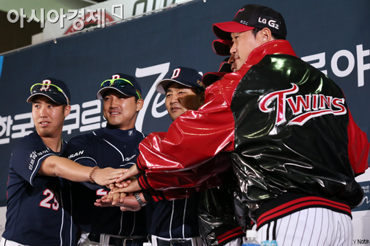 [아시아경제 정재훈 기자] 15일 오후 서울 잠실야구장에서 열린 LG 트윈스와 두산 베어스의 '2013 한국야쿠르트 세븐 프로야구' 플레이오프 미디어데이. 양 팀 감독과 선수들이 손을 모으고 포즈를 취하고 있다.정재훈 기자 roze@asiae.co.kr<ⓒ세계를 보는 창 경제를 보는 눈, 아시아경제(www.asiae.co.kr) 무단전재 배포금지>