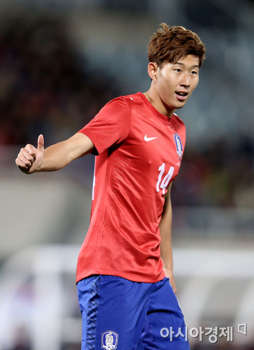 [천안=아시아경제 정재훈 기자] 15일 오후 천안종합운동장에서 열린 한국과 말리의 평가전. 손흥민이 동료를 향해 엄지 손가락을 들고 있다.정재훈 기자 roze@asiae.co.kr<ⓒ세계를 보는 창 경제를 보는 눈, 아시아경제(www.asiae.co.kr) 무단전재 배포금지>