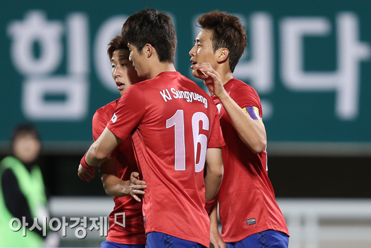 [천안=아시아경제 정재훈 기자] 홍명보 감독이 이끄는 축구국가대표팀이 15일 오후 천안종합운동장에서 열린 말리와의 평가전에서 구자철, 손흥민, 김보경의 골로 3:1 승리를 거뒀다. 선제골을 넣은 구자철이 손흥민, 기성용과 기쁨을 나누고 있다.정재훈 기자 roze@asiae.co.kr<ⓒ세계를 보는 창 경제를 보는 눈, 아시아경제(www.asiae.co.kr) 무단전재 배포금지>
