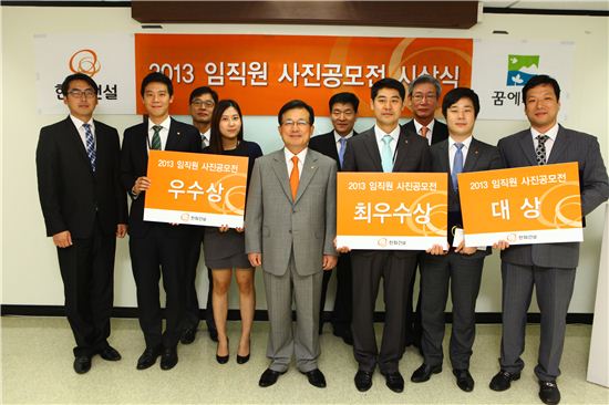 16일 한화건설이 일하기 좋은 직장만들기 프로그램(GWP)의 일환으로 임직원 사진 공모전을 진행하고 이에 대한 시상식을 가졌다. 이근포 한화건설 대표(가운데)와 직원들이 기념촬영하고 있다.