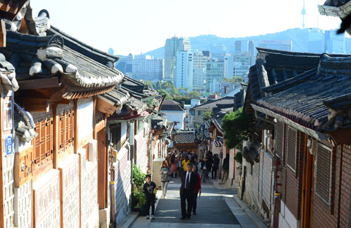 [아시아경제 김지은 기자]서울 종로구 재동 헌법재판소 앞 북촌로를 따라 올라가다 서쪽으로 난 북촌로 11가길 작은 골목으로 들어서면 고즈넉한 정취를 지닌 한옥들이 방문객들의 발걸음을 맞이한다. 양옆에 한옥들이 늘어선 가회동 31번지 언덕에서 남쪽을 내려다보면 한옥 지붕과 처마끝 사이로 펼쳐지는 빼곡한 고층 건물들이 장관이다. 가을이 무르익어가는 다소 쌀쌀한 날씨에 북촌에서는 수많은 외국인 관광객들이 연신 카메라 셔터를 누르며 한옥의 생김새 하나하나를 음미하고 있었다. 도심 속 북촌은 서울의 그 어떤 곳보다 우리 전통의 멋과 정취에 흠뻑 빠져볼 수 있는 공간이다. 청계천과 종로의 윗동네라는 이름에서 붙여진 '북촌'은 경복궁과 창덕궁 사이에 자리잡고 있다. 여기에 배산임수라는 최적의 지리적 조건까지 갖춰 북촌은 조선시대 권문세가와 왕족, 사대부 양반들의 거주지였다. 이들이 북촌에서 가진 땅의 면적과 한옥 수는 상당했지만 한일합방 후 국가로부터 녹봉을 받을 수 없게 되자 일제강점기에 등장한 주택경영회사들에게 팔아 넘길 수밖에 없었다. 서울의 주택난이 심화되는 가운데 주택경영회사들은 북촌의 땅을 사들여 집단적 한옥주거지를 짓기 시작했다.가회동 31번지 언덕에서 바라본 한옥의 풍경과 멀리 보이는 서울 도심. <br />