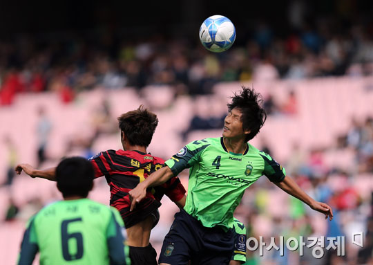 [전주=아시아경제 정재훈 기자] 19일 오후 전주월드컵경기장에서 열린 '2013 하나은행 FA컵 결승전' 전북 현대와 포항 스틸러스의 경기. 박성호와 김상식이 헤딩 다툼을 벌이고 있다.정재훈 기자 roze@asiae.co.kr<ⓒ세계를 보는 창 경제를 보는 눈, 아시아경제(www.asiae.co.kr) 무단전재 배포금지>