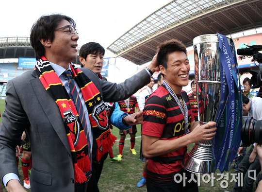 [전주=아시아경제 정재훈 기자] 포항 스틸러스가 19일 오후 전주월드컵경기장에서 열린 '2013 하나은행 FA컵 결승전' 전북 현대와의 경기에서 승부차기 끝에 우승컵을 차지했다. 황선홍 감독이 이명주의 머리를 쓰다듬고 있다.정재훈 기자 roze@asiae.co.kr<ⓒ세계를 보는 창 경제를 보는 눈, 아시아경제(www.asiae.co.kr) 무단전재 배포금지>